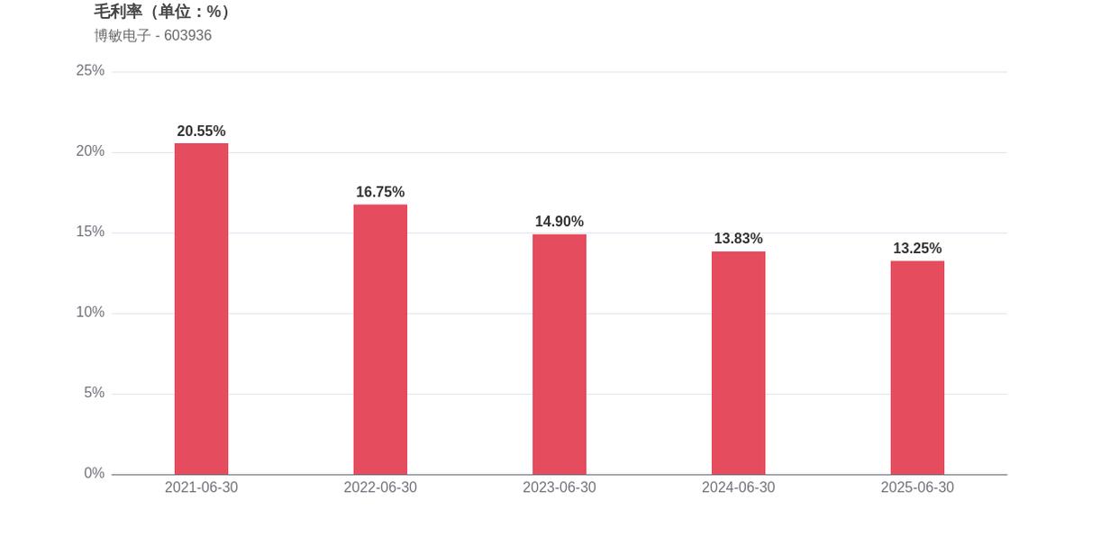 从反映盈利质量的指标来看,博敏电子净利率已连续5年同期下滑,2025年上半年降至2.22%,较去年同期下降1.43个百分点,毛利率连续4年同期下滑至13.25%,净资产收益率同样连续5年同期下滑至0.89。