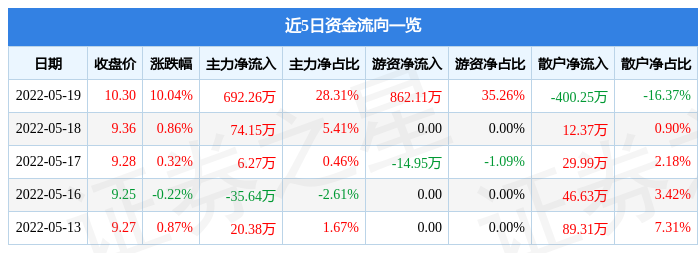 资金流向数据方面,5月19日主力资金净流入692.26万元,游资资金净流入862.11万元,散户资金净流出400.25万元。