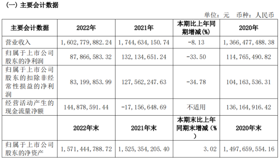 丽岛新材近日发布2022年报。报告期内,公司实现营业收入16.03亿元,同比下降8.13%;净利润8786.66万元,同比下降 33.50%,扣非净利润8320万元,较2021 年下降34.78%,为近3年来首次出现负增长。