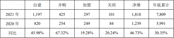 年报显示,益丰药房根据“区域聚焦,稳健扩张”的发展战略,通过“新开+并购+加盟”的门店拓展模式,2021年净增门店1818家,其中,自建门店1197家,并购门店425家,新增加盟店297家,关闭门店101家。至2021年末,益丰药房门店总数7809 家(含加盟店932 家),同比增长30.35%。2022年第一季度,门店数量达到8225家(含加盟店996家)。