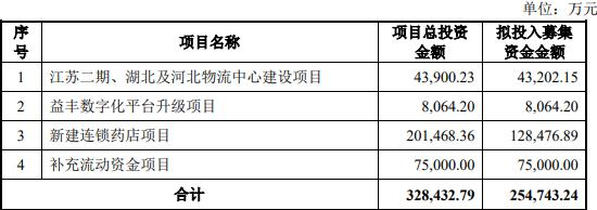 本次发行的募集资金总额不超过25.47亿元(含25.47亿元),扣除发行费用后,拟分别用于江苏二期、湖北及河北物流中心建设项目、益丰数字化平台升级项目、新建连锁药店项目、补充流动资金项目。