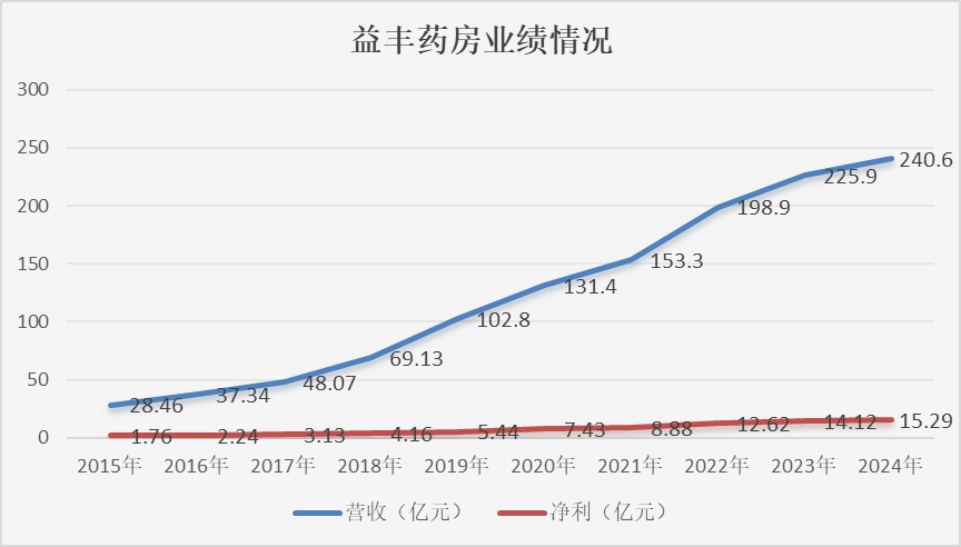 依靠不断扩店的策略 益丰药房 尝尽甜头。公司的营收规模从2015年的28.46亿元增长至2024年的240.62亿元,归母净利润同步从1.76亿元攀升至15.29亿元。资本市场也给予积极回应,2020年巅峰时期总市值一度逼近580亿元。