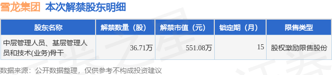 根据市场公开信息整理,雪龙集团(603949)于4月15日将有36.71万股限售股份解禁上市,为公司股权激励限售股份,占公司总股本0.17%。本次解禁后,公司还有96.34万股限售股份,占总股本0.46%。具体如下图所示:
