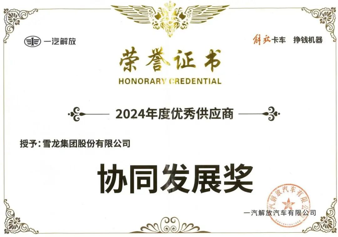 2024年12月,以“共创,共进,共赢,共享”为主题的一汽解放2025全球合作伙伴大会在中国青岛闭幕!雪龙集团荣获一汽解放2024年度优秀供应商“协同发展奖”,并被一汽解放授牌为“解放爱领航·关爱货车司机项目”公益伙伴。总经理贺频艳应邀出席大会,并代表公司接受表彰。