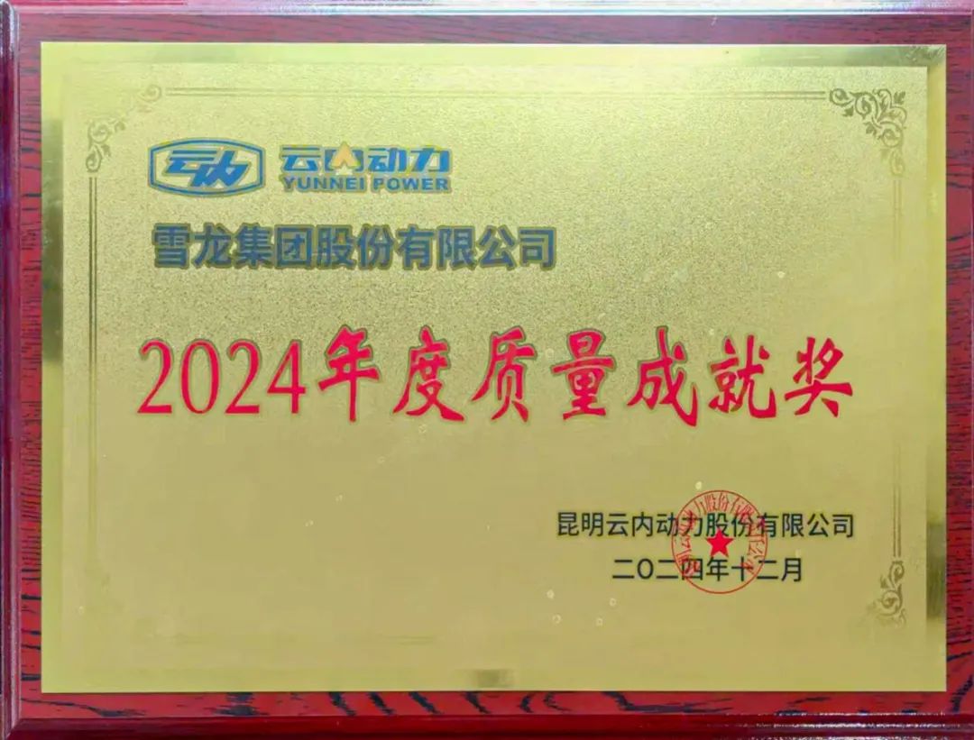 2024年12月27日,雪龙集团在云内动力2025年供应商大会上荣获“2024年度质量成就奖”。总经理贺频艳代表公司接受表彰。