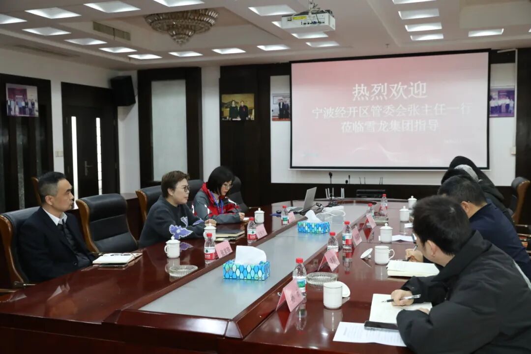 2026年1月22日上午,宁波经济技术开发区管委会副主任张超群携区金融发展服务中心主任伊海江、副主任苏向红等一行莅临公司,开展专题调研,深入了解企业当前经营状况与未来战略规划。雪龙集团总经理贺频艳、副总经理竺菲菲、财务总监张家骅等公司高管热情接待并参与座谈。