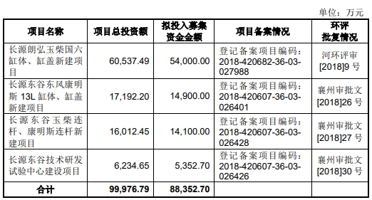长源东谷募集资金总额为9.15亿元,扣除发行费用后,募集资金净额为8.84亿元。长源东谷2020年4月21日披露的招股说明书显示,公司拟募集资金8.84亿元,拟分别用于“长源朗弘玉柴国六缸体、缸盖新建项目”、“长源东谷东风康明斯13L缸体、缸盖新建项目”、“长源东谷玉柴连杆、康明斯连杆新建项目”、“长源东谷技术研发试验中心建设项目”。