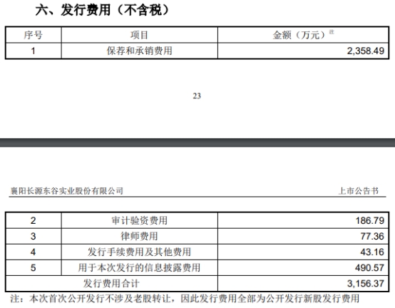 长源东谷上市发行费用为3,156.37万元,其中保荐机构第一创业证券承销保荐有限责任公司获得保荐和承销费用2,358.49万元。