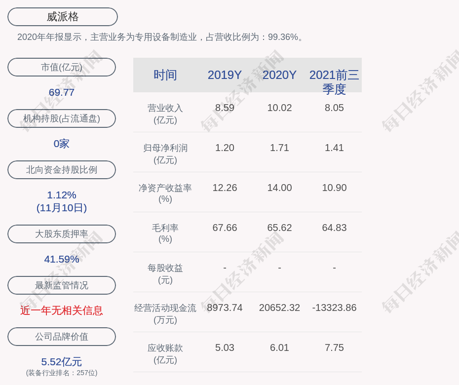 2020年年报显示,威派格的主营业务为专用设备制造业,占营收比例为:99.36%。