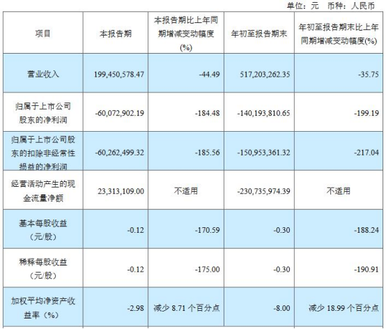 第三季度,公司营业收入1.99亿元,同比减少44.49%;归属于上市公司股东的净利润-6007.29万元,同比减少184.48%;归属于上市公司股东的扣除非经常性损益的净利润-6026.25万元,同比减少185.56%;经营活动产生的现金流量净额2331.31万元。