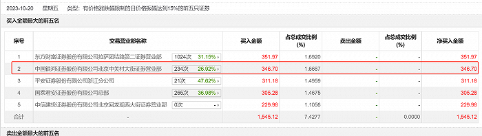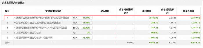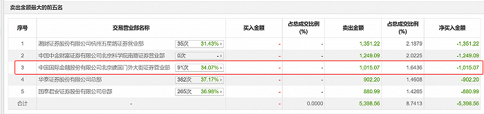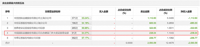 比如,中金公司北京建国门外大街营业部在“交易异动成交营业部榜单”上屡次出没。该营业部在2023年10月20日卖出238万元,2024年1月23日卖出1015.07万元,1月25日卖出2189.62万元,同时买入924.13万元。