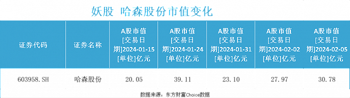 从市值上看,连续7个交易日涨停后哈森股份市值直接翻倍,从1月15日的20亿元直接涨至39亿元;后历经5个跌停,再度露出原形,市值在5个交易日内暴跌16亿元,于1月31日降至23亿元。在历经2月的三个涨停后市值再度升近8亿元,截至2月5日收盘市值达31亿元。