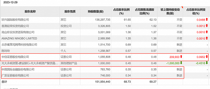 据哈森股份2023年12月29日公示的十大流通股东,广发证券、中金公司为新进股东,中信证券也加仓近21万股。