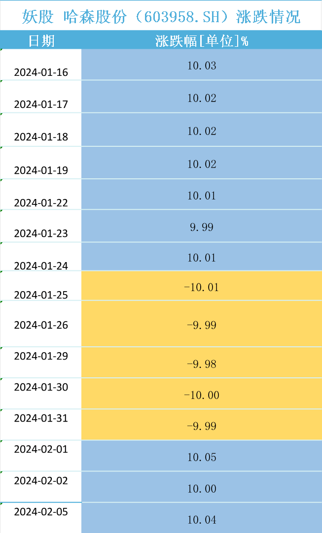 纵览哈森股份走势:1月16日至1月24日连续7个交易日涨停,涨幅达70%,而后在1月25日至1月31日连续5个交易日跌停,跌幅达50%,进入2月的三个交易日又持续涨停。