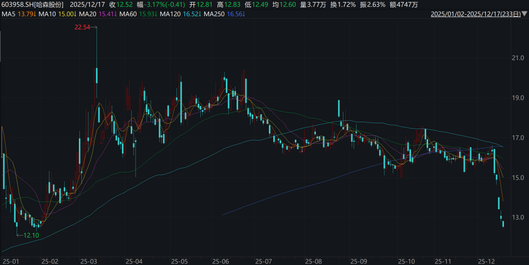 公告发布后, 哈森股份 股价连续下挫,截至12月17日午盘收于12.52元/股,最近三天跌幅近16%。