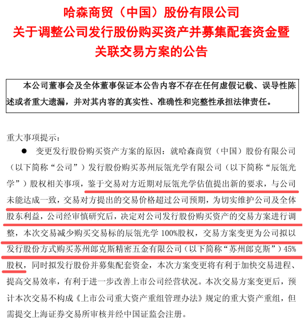 哈森股份 (603958.SH)近日发布公告,宣布对原发行股份购买资产方案进行调整:终止收购 苏州辰瓴光学有限公司 (下称辰瓴光学)100%股权事宜;同时保留原方案中以发行股份方式收购 苏州郎克斯精密五金有限公司 (下称苏州郎克斯)45%股权的交易。本次交易完成后, 哈森股份 将实现对苏州郎克斯100%股权的控制。