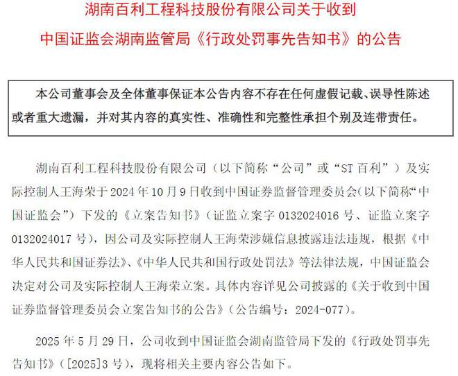 30日晚,ST百利公告,收到湖南证监局《行政处罚事先告知书》。