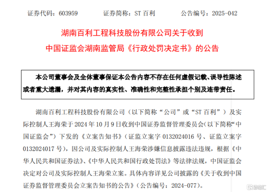 早在2024年10月9日,因涉嫌信息披露违法违规,ST百利及实际控制人王海荣就收到了证监会的《立案告知书》,自此,监管部门开启了对该事件的调查。