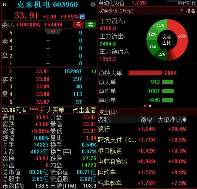 2月23日,克来机电开盘一字涨停,录得11个涨停板,截至发稿,该股报33.91元,换手率0.54%,成交金额4823万元,涨停板封单超15万手。
