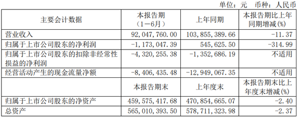 报告期内,公司实现营收9204.78万元,同比降低11.37%;归母净利润为-117.3万元,同比降低314.99%;扣非净利润为-432.03万元,去年同期为-135.27万元。