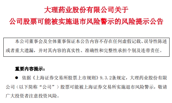 依据《上海证券交易所股票上市规则》9.3.2条规定,大理药业股份有限公司(以下简称“公司”)股票可能被上海证券交易所实施退市风险警示。