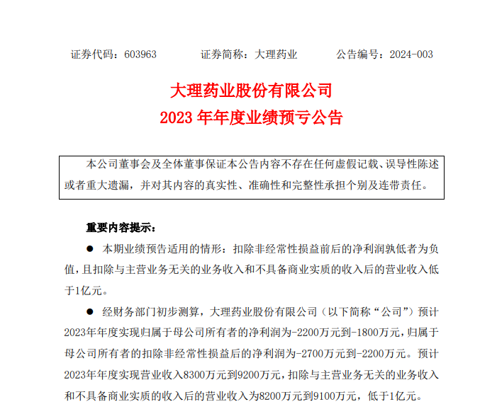 1月31日,大理药业发布2023年年度业绩预亏公告。