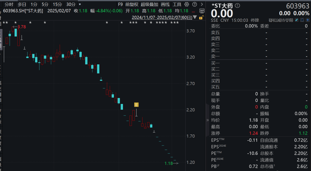 由于此前业绩预告触及上交所财务退市标准,*ST大药已提前锁定了退市。此后由于投资者持续卖出,公司股价自1月17日起连续跌停,至2月7日,*ST大药股票收盘总市值为2.59亿元,且已连续20个交易日收盘总市值低于5亿元,最终导致公司因先触及交易类强制退市指标而停牌。