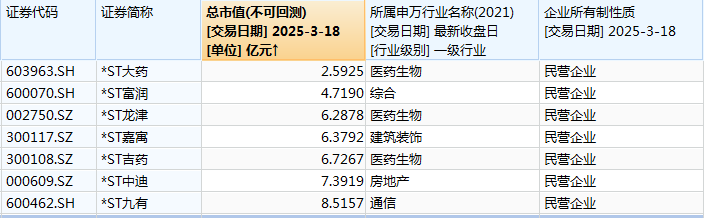 而从可以“量化”的维度观察,目前存在交易类退市风险的公司数量不多。截至3月18日,除了*ST大药以外,仅有*ST富润一家市值低于5亿元(4.72亿元),另有*ST嘉寓、*ST龙津和*ST吉药三家公司市值在6.2亿元至6.8亿元之间。
