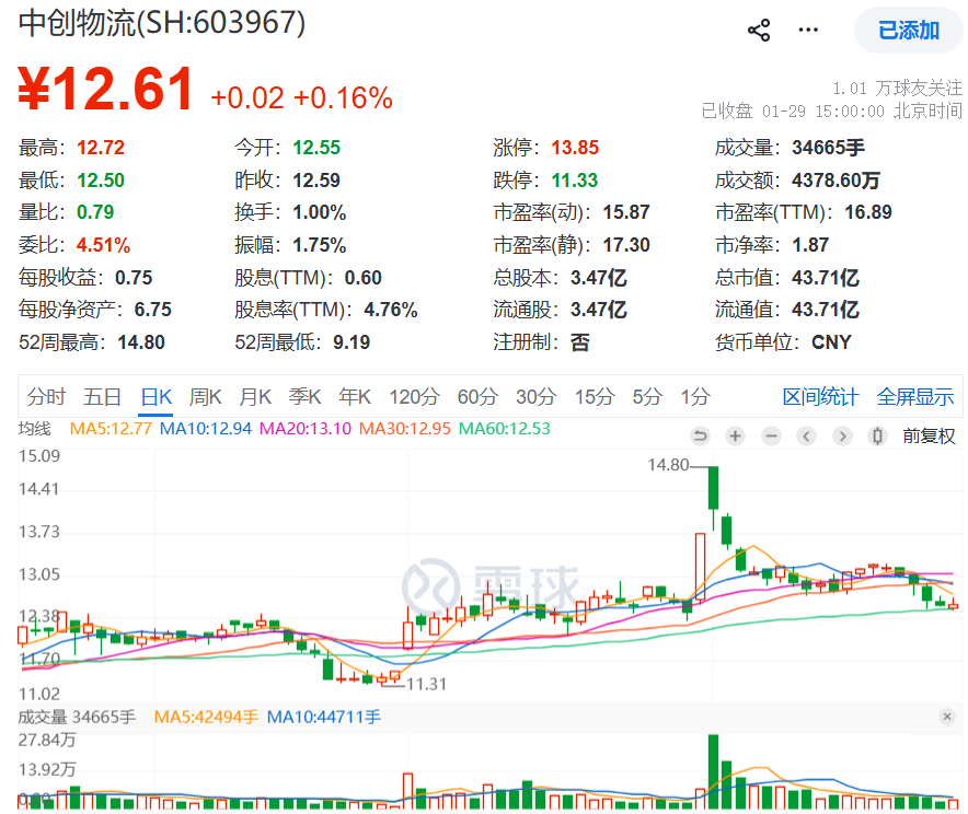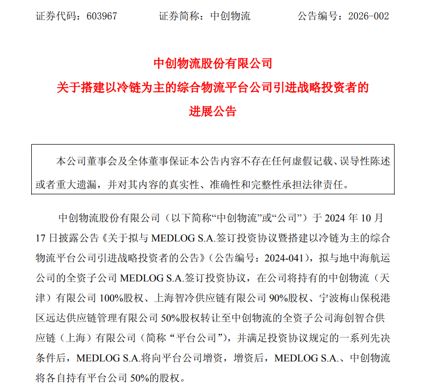 1月29日,中创物流公告,披露其与战略投资者MEDLOG S.A.就搭建以冷链为主的综合物流平台项目的最新进展。