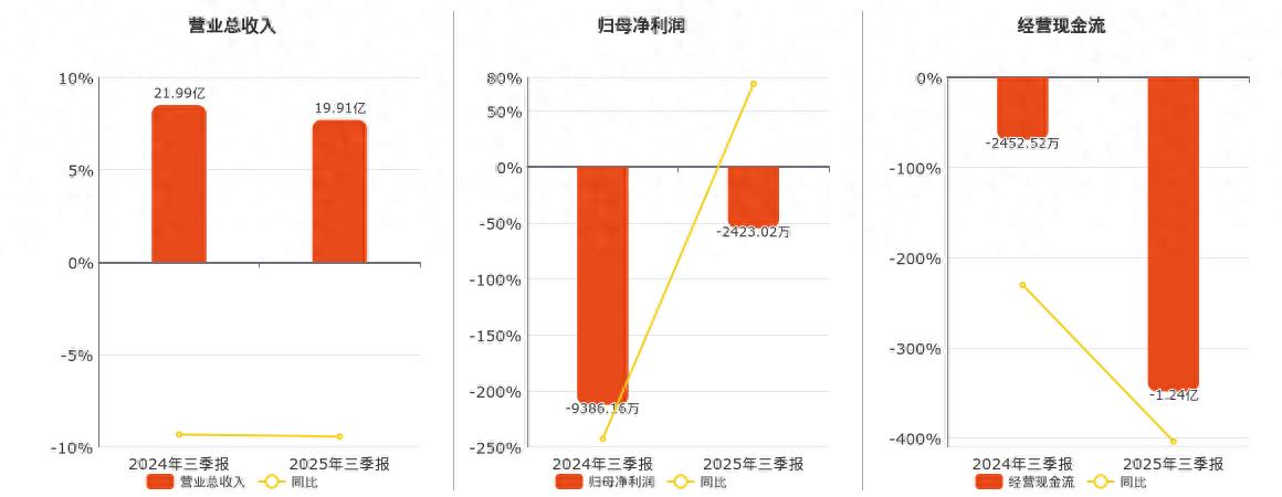 公司营业总收入为19.91亿元,较去年同报告期营业总收入减少2.08亿元,同比较去年同期下降9.44%。归母净利润为-2423.02万元,在已披露的同业公司中排名第163。经营活动现金净流入为-1.24亿元,在已披露的同业公司中排名第175,较去年同报告期经营活动现金净流入减少9904.75万元。