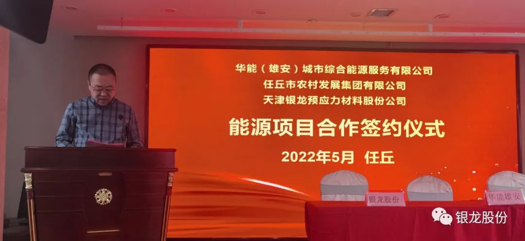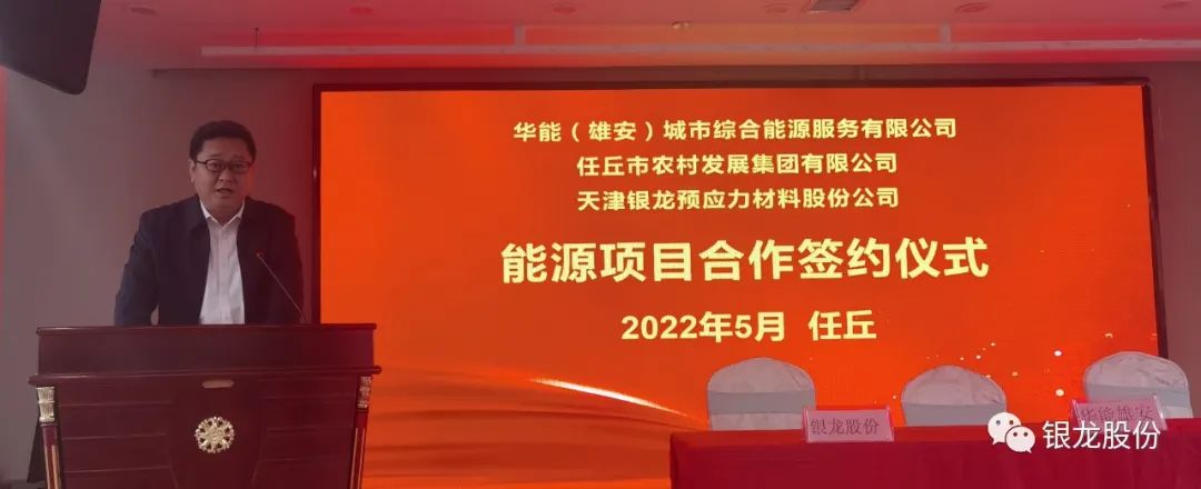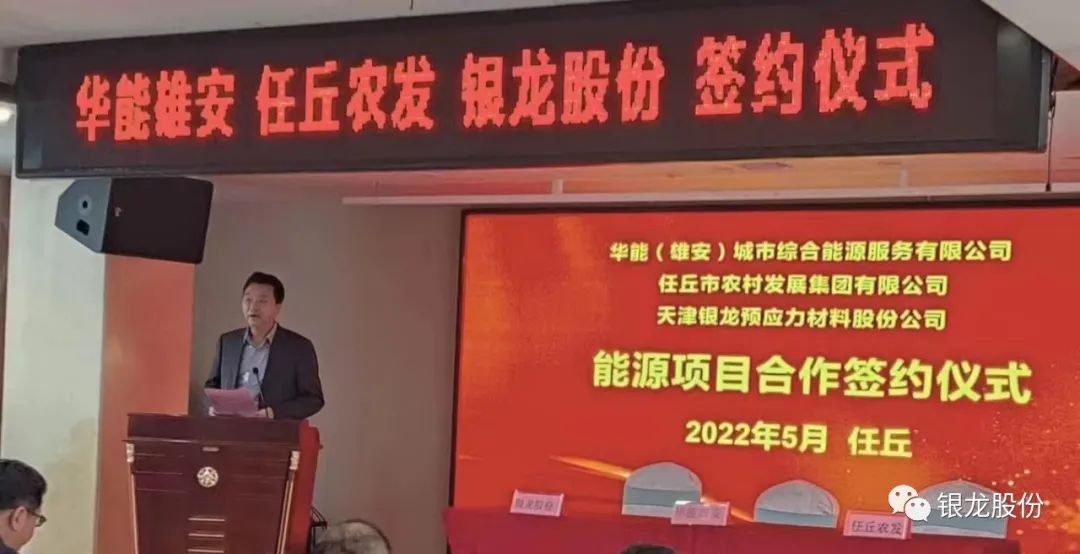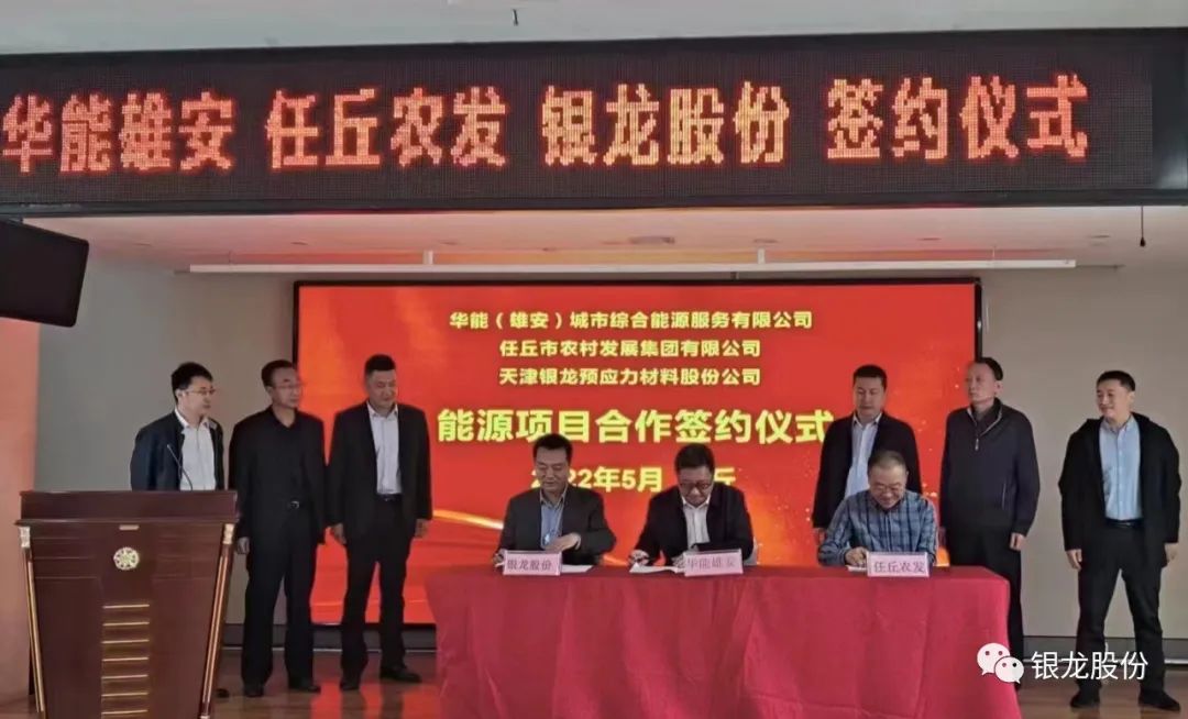 2022年5月9日,华能(雄安)城市综合能源服务公司、任丘市农村发展集团有限公司、天津银龙预应力材料股份有限公司在任丘市政府会议厅举办了能源项目合作签约仪式。华能集团雄安分公司总经理鲁治城、农发集团刘卫东董事长、天津银龙股份董事长谢志峰共同出席仪式并签订股东出资合作协议。