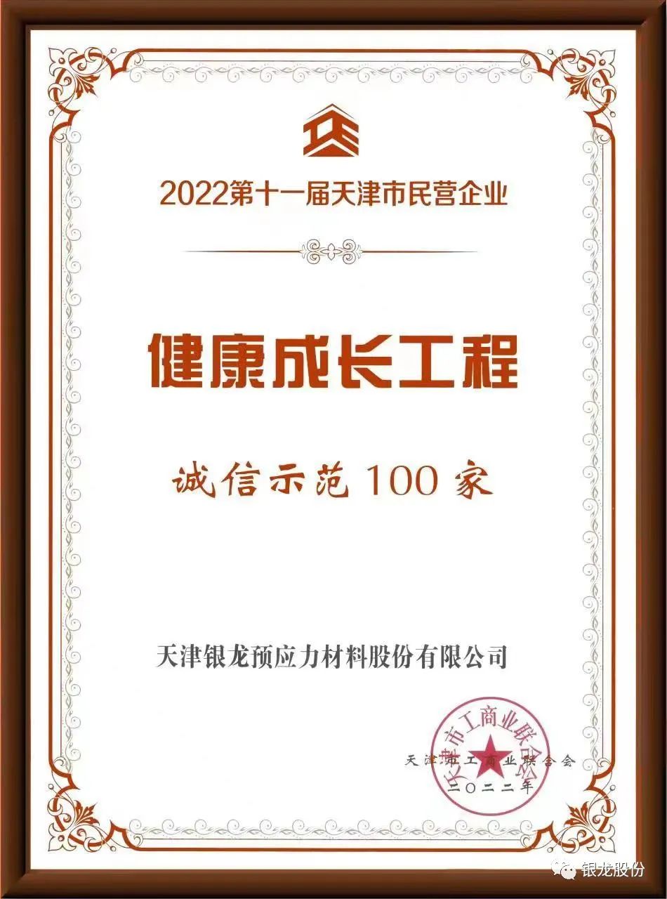 天津银龙预应力材料股份有限公司在本届“健康成长工程”上荣登三个百强榜单,分别是科技创新100强、战略性新兴产业100强、以及诚信示范100强。