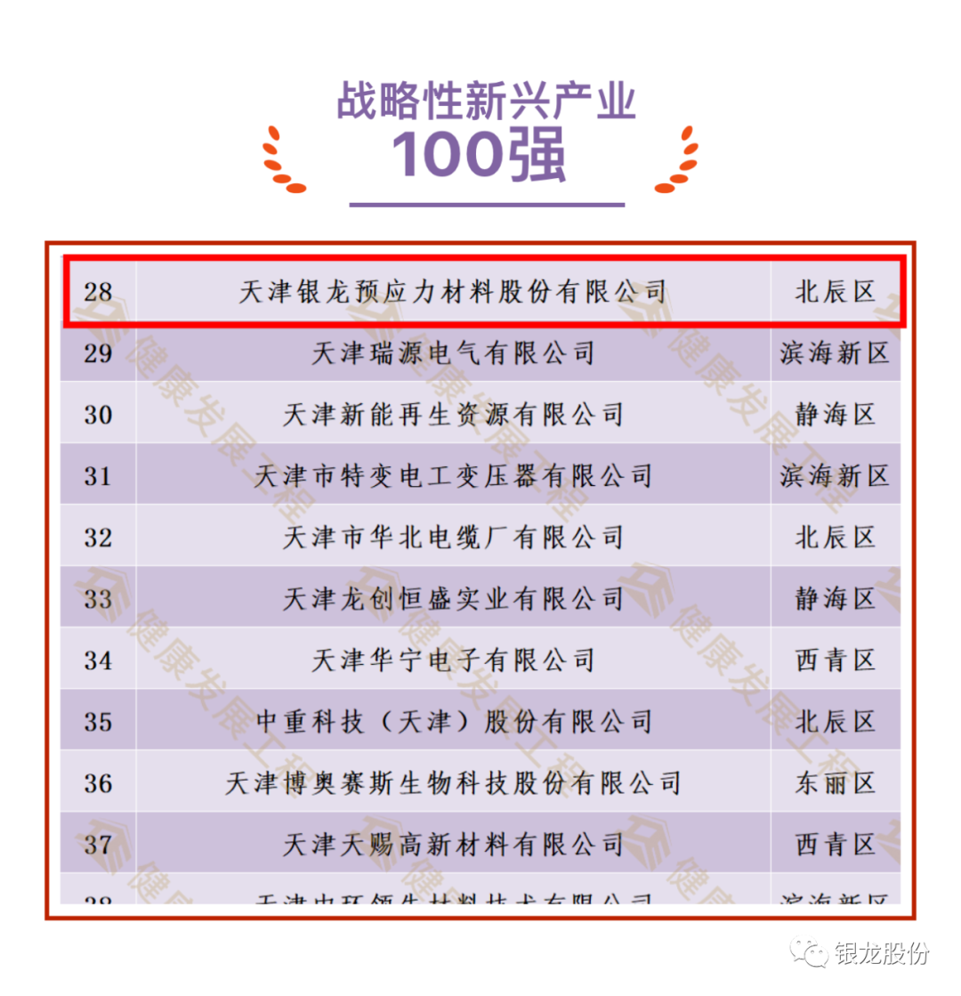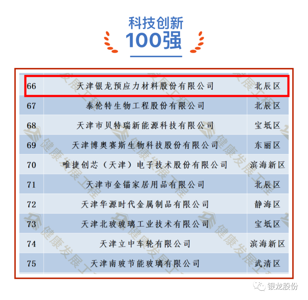 天津银龙预应力材料股份有限公司荣登本届“健康成长工程”三个百强榜单,分别为诚信示范100强、科技创新100强以及战略性新兴产业100强。