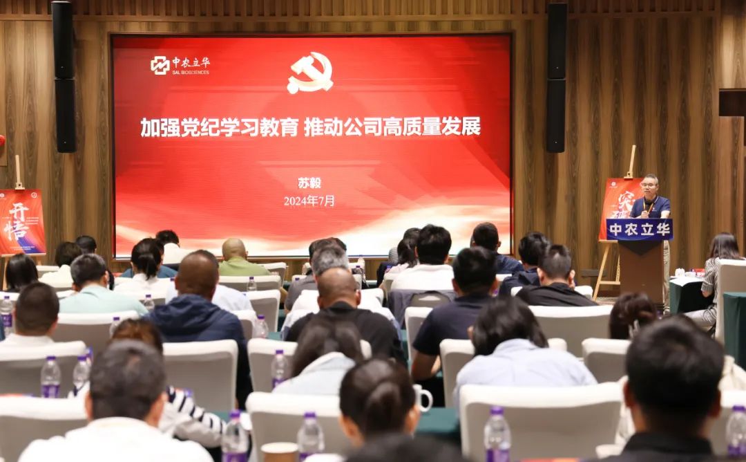 7月11日,中农立华党委书记、董事长苏毅以“加强党纪学习教育推动公司高质量发展”为主题,为公司党员干部讲纪律党课。公司中高管团队参加学习。