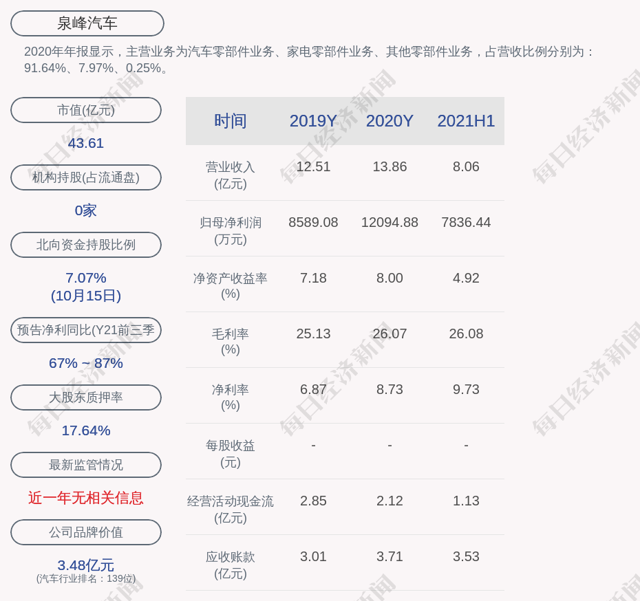2020年年报显示,泉峰汽车的主营业务为汽车零部件业务、家电零部件业务、其他零部件业务,占营收比例分别为:91.64%、7.97%、0.25%。