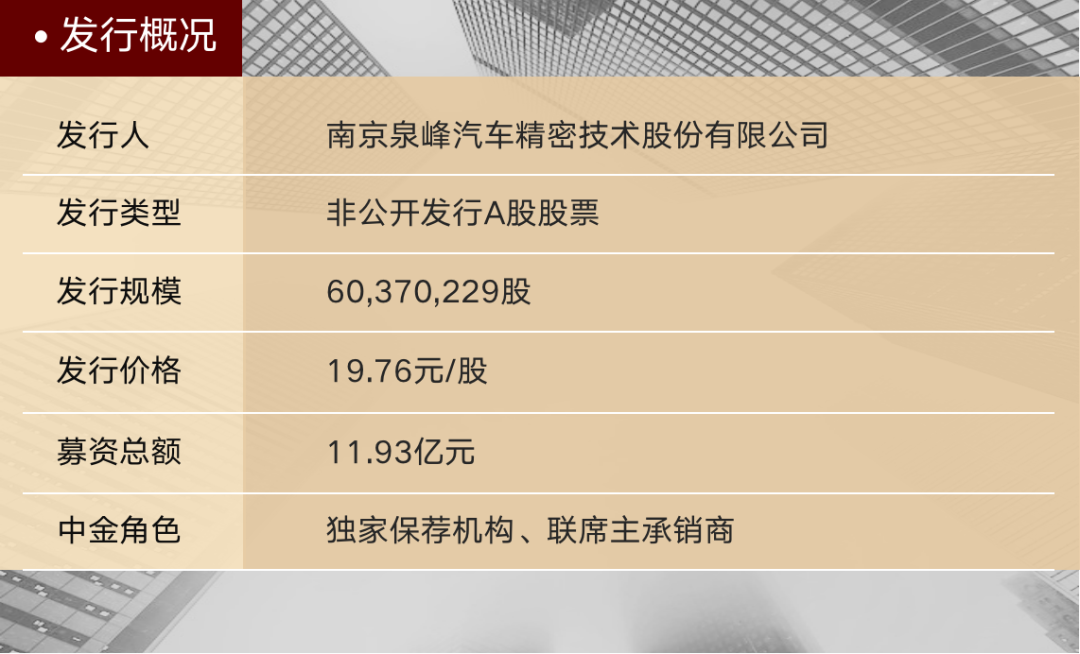南京泉峰汽车精密技术股份有限公司(以下简称“泉峰汽车”或“公司”,代码:603982.SH)于2022年12月12日正式完成非公开发行A股股票,本次发行规模为人民币11.93亿元。中金公司担任本项目的独家保荐机构和联席主承销商。