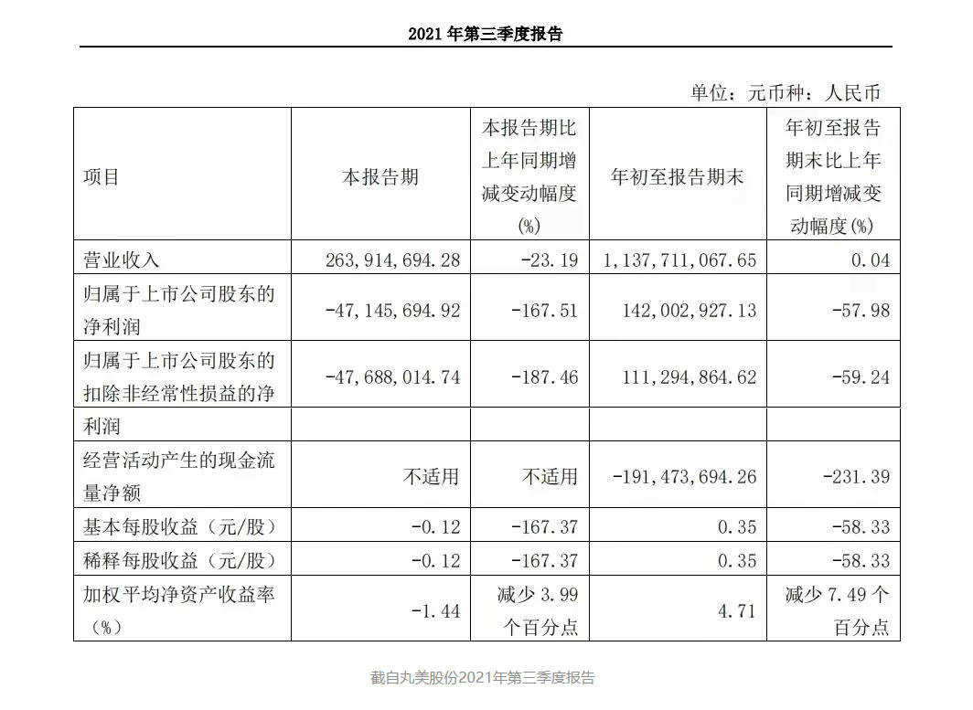 丸美股份第三季度财报显示,今年7-9月,公司实现营业收入2.64亿元,同比下降23.19%;净利润为-4715万元,同比下降167.51%。今年前三季度,公司实现营业收入11.38亿元,同比增长0.04%;净利润1.42亿元,同比下降57.98%。同时,财报还显示,截至今年9月30日,丸美股份的经营性现金流为-1.91亿元。