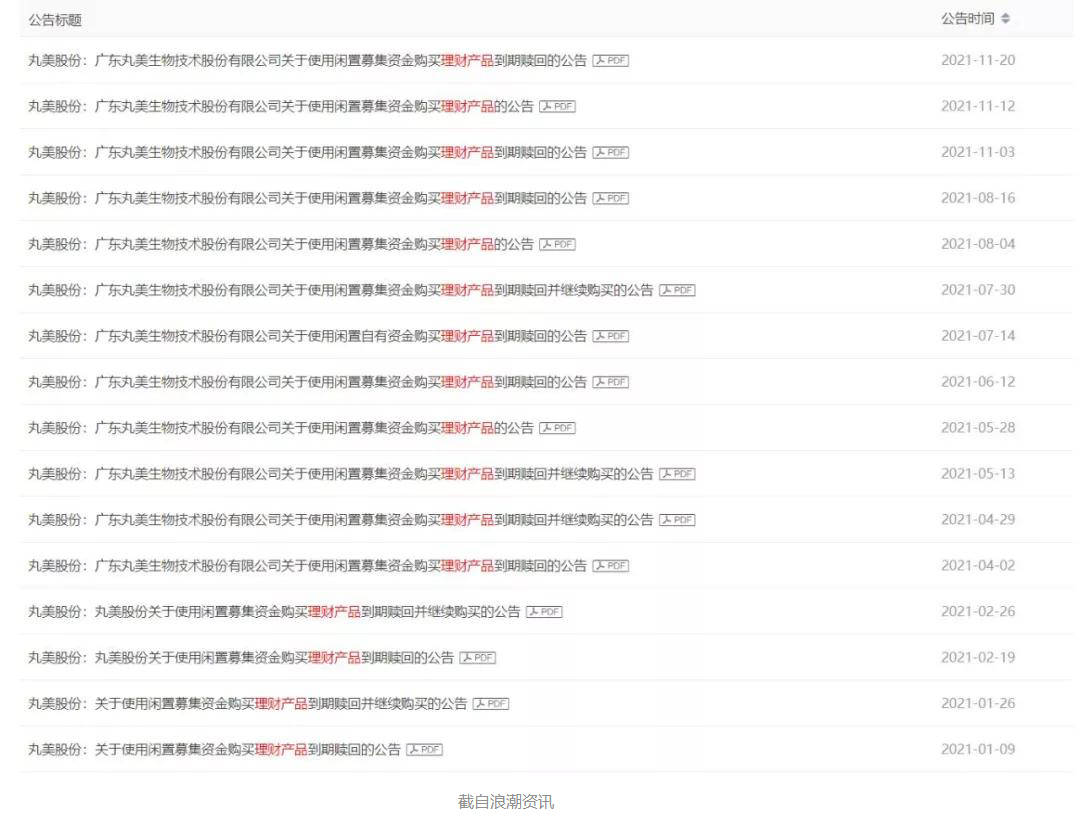 鳌头财经梳理丸美股份所发布的“理财产品”相关的公告显示,自今年1月份以来,该公司共发布了16条相关公告,其内容均为披露公司或丸美科技利用闲置募集资金购买理财产品的使用和收益情况。