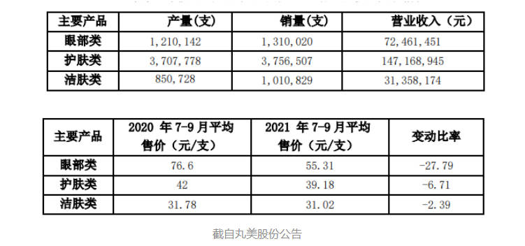 值得一提的是,在今年化妆品原材料普遍上涨的情况之下,今年第三季度,丸美股份旗下眼部、护肤、洁肤三类产品平均售价却均有下降。值得一提的是,因为配赠力度加大,导致该公司眼部类产品平均单价较上年同期下降了27%。而产品售价的降低也可视作丸美股份营收减少的重要原因之一。