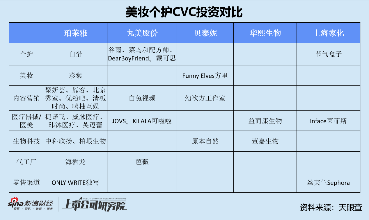比对珀莱雅、丸美股份、贝泰妮及投资活跃度较低的华熙生物、上海家化的投资案例不难发现,美妆个护的CVC投资有以下共同特点: