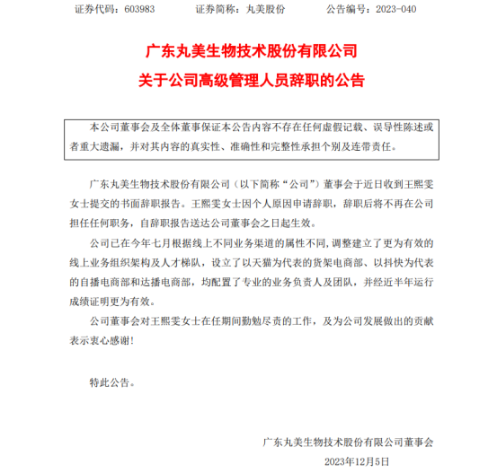 近日,广东丸美生物技术股份有限公司(603983.SH)发布公告称,公司董事会于近日收到王熙雯提交的书面辞职报告。王熙雯由于个人原因申请辞去在公司的职务,辞职报告生效后将不再担任任何职务。