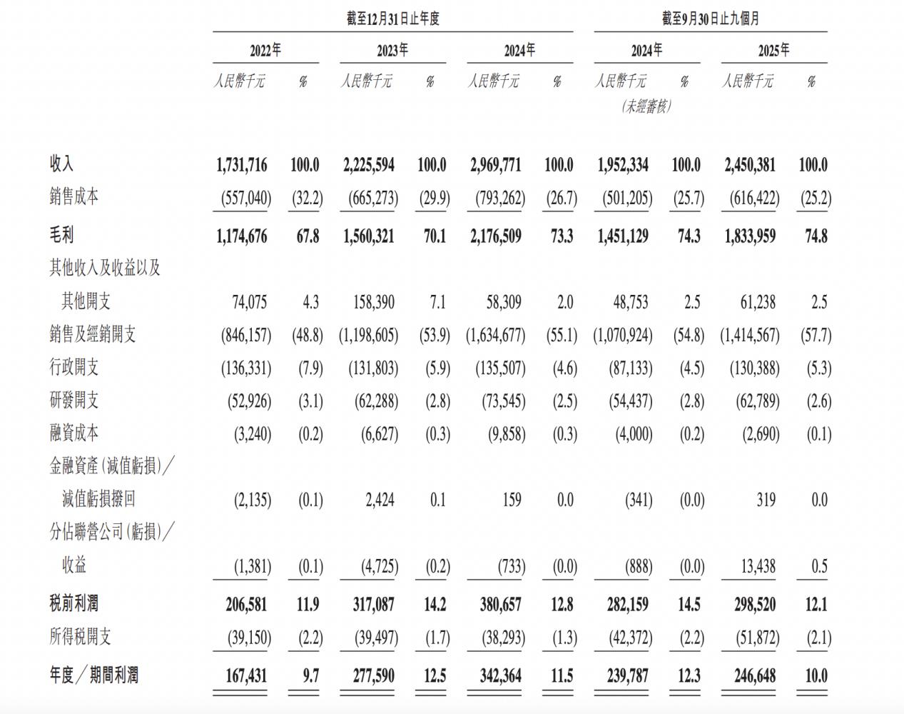 2025年前三季度, 丸美生物 收入24.5亿元,同比增长25.51%;期间利润为2.47亿元,同比增长2.86%;毛利率为74.8%,上年同期为74.3%。