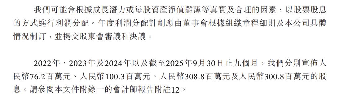 过去几年, 丸美生物 持续进行大额分红。2022年-2024年及2025年前9月, 丸美生物 分别宣布7620万元、1亿元、3.09亿元及3.01亿元的股息,合计股息7.86亿元,占期间利润总额76%。