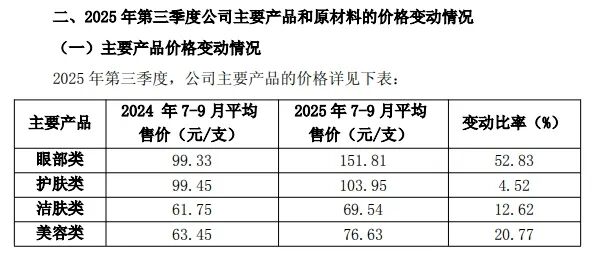 与此同时,公司四大类产品(眼部、护肤、洁肤、美容)的平均售价均实现同比上涨,其中眼部类产品均价涨幅高达52.83%。