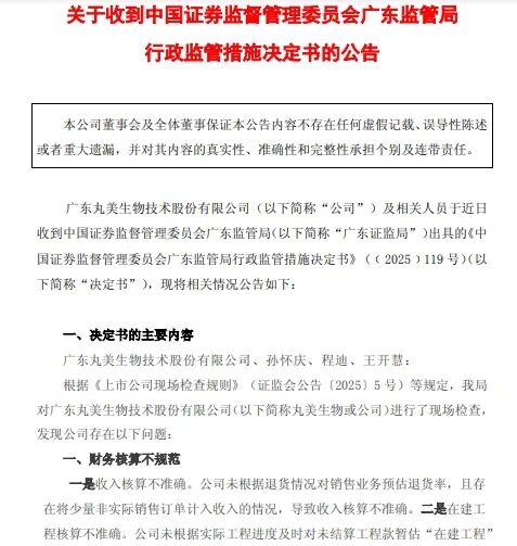 同日,广东证监局也对公司发布了监管警示,丸美生物存在收入核算不准确、在建工程核算不及时、会计科目错误列报等多重问题,导致2025年上半年营收虚增454.68万元,净利润虚增1132.97万元。