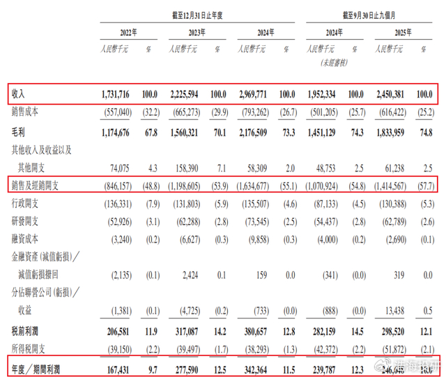 然而高毛利未能有效转化为净利润,公司面临“增收不增利”的挑战。2025年前三季度,营收同比增长25.5%,净利润增速却降至2.86%,同期销售费用率飙升至57.7%,反映“烧钱换流量”模式正侵蚀利润空间。
