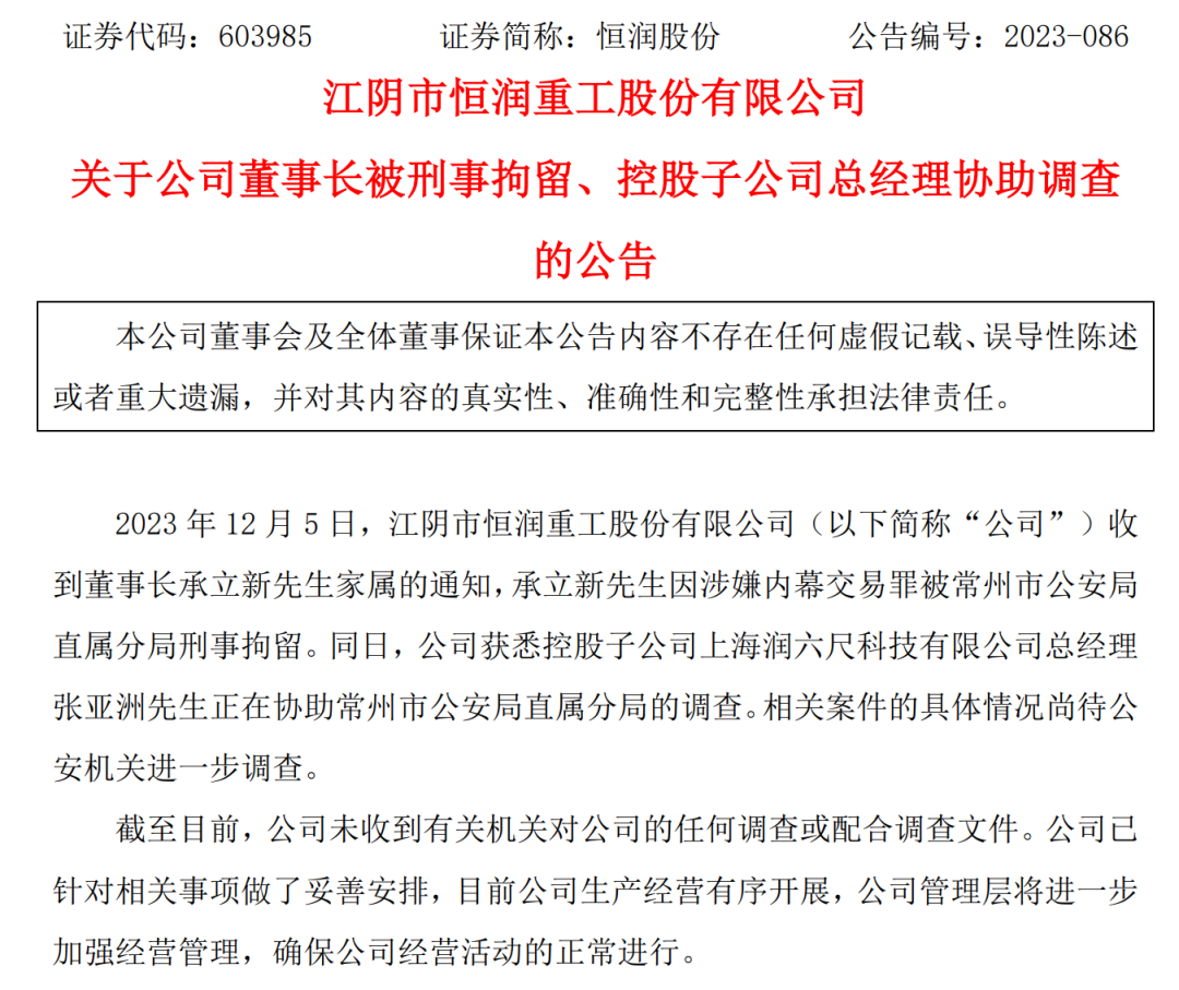 此前在12月5日晚间,恒润股份公告,公司收到董事长承立新家属的通知,承立新因涉嫌内幕交易罪被常州市公安局直属分局刑事拘留;同日,公司获悉控股子公司润六尺总经理张亚洲正在协助常州市公安局直属分局的调查。