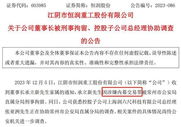 12月5日晚,恒润股份发布公告称公司董事长承立新因涉嫌内幕交易罪被常州市公安局直属分局刑事拘留。同日,控股子公司上海润六尺科技有限公司总经理张亚洲正在协助常州市公安局直属分局的调查。
