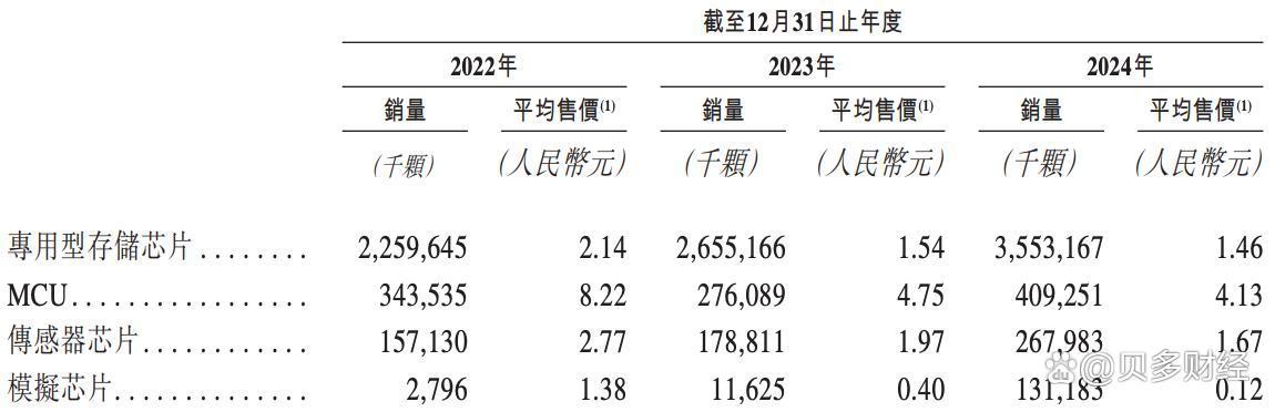 尽管如此,兆易创新2024年的营收、净利润规模仍低于2022年。与之对应的是,兆易创新的核心——专用型存储芯片2024年的销量增至35.53亿颗,2022年、2023年分别为22.60亿颗、26.55亿颗,但平均售价则分别为2.14元、1.54元、1.46元,持续走低。