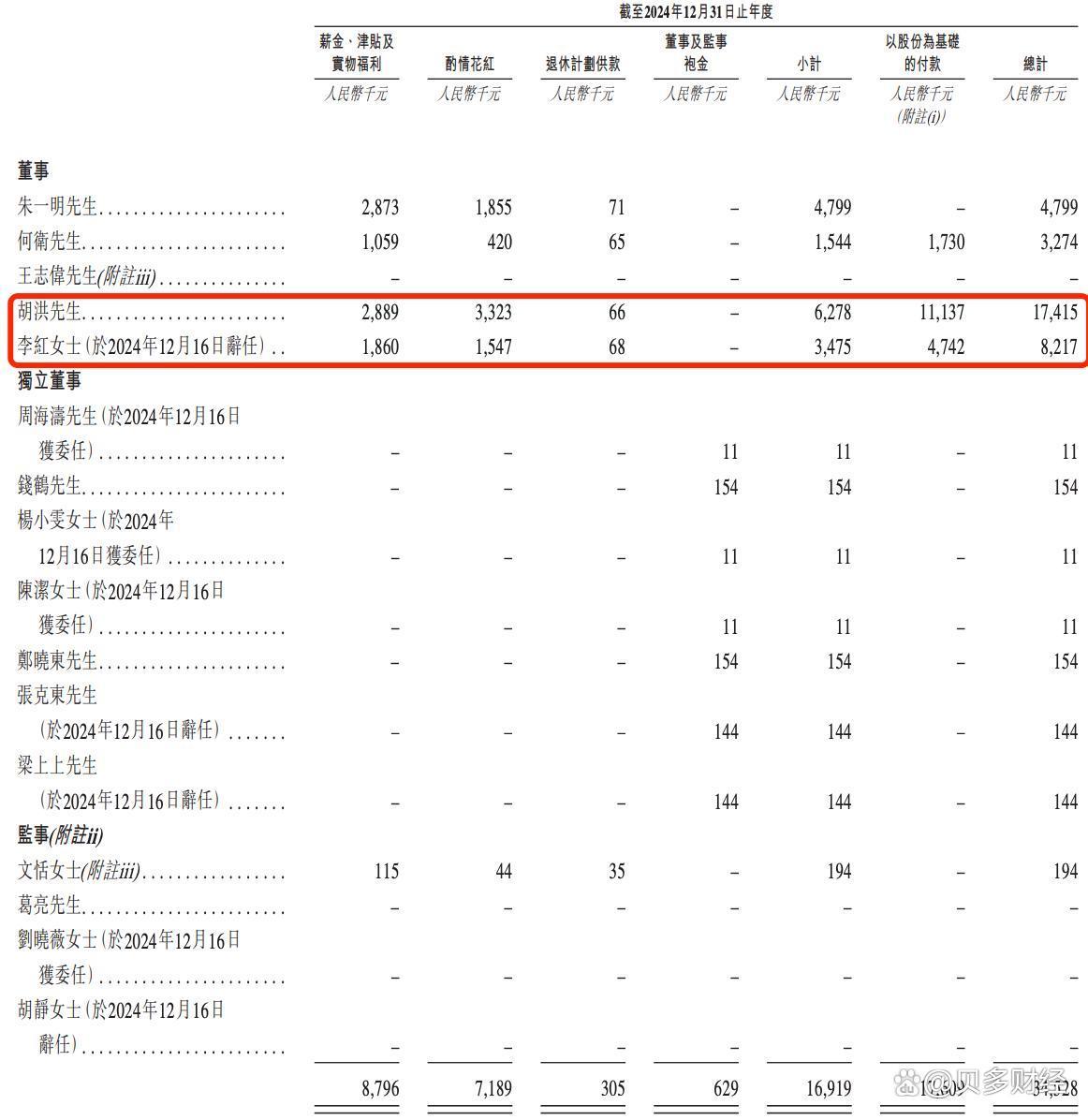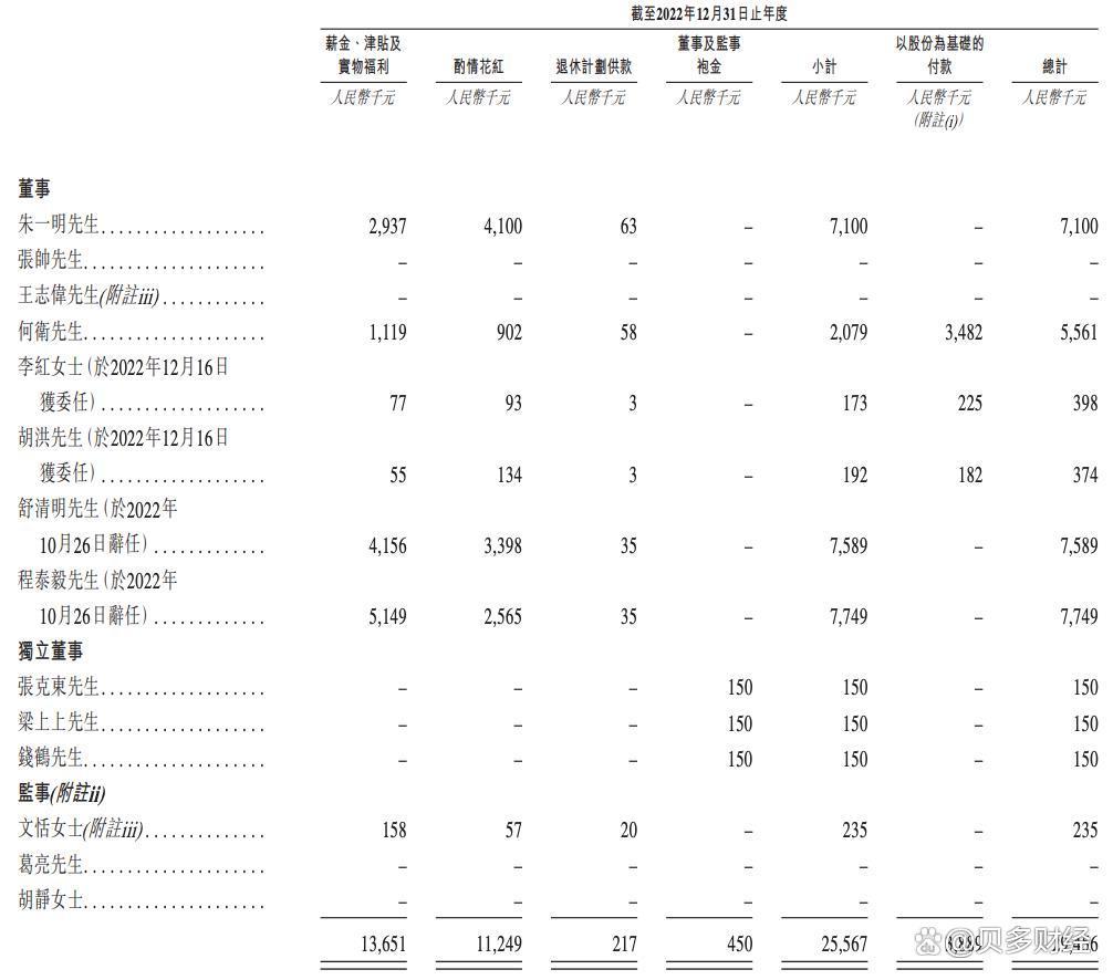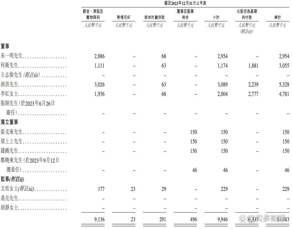 2023年,朱一明、何卫、李红、胡洪的薪酬总计分别约为295.4万元、305.5万元、532.8万元和478.1万元,整体较2022年有所减少。其中,何卫、李红、胡洪分别取得以股份为基础的付款开支188.1万元、223.9万元和277.7万元。